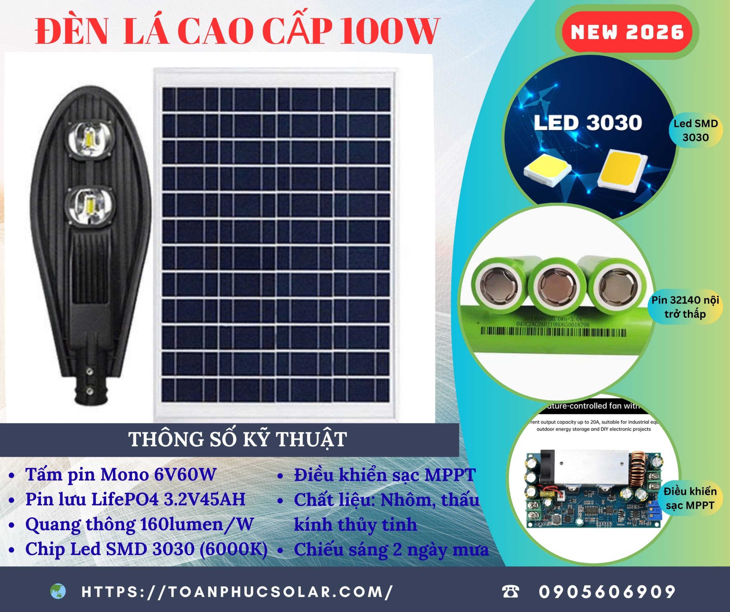 Với thông số mạnh mẽ và độ bền cao, Đèn lá năng lượng mặt trời 100W là lựa chọn lý tưởng cho chiếu sáng ngoài trời, vừa tiết kiệm chi phí, vừa bảo vệ môi trường, phù hợp xu hướng “Năng lượng xanh – Chiếu sáng thông minh”.