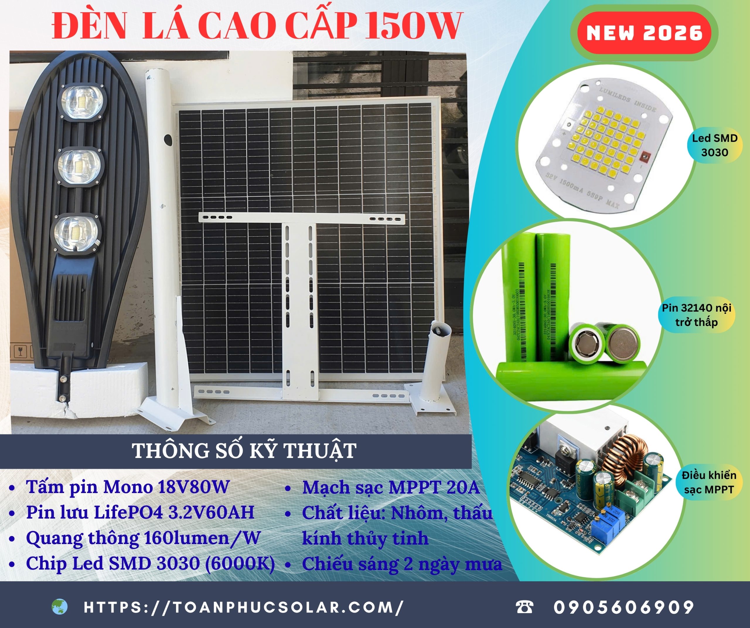 Đèn năng lượng mặt trời Lá 150W là dòng sản phẩm cao cấp được thiết kế chuyên dụng cho chiếu sáng ngoài trời như đường làng, ngõ xóm, sân vườn, khuôn viên, trang trại và khu dân cư. Với thiết kế hiện đại, hiệu suất chiếu sáng vượt trội và khả năng hoạt động hoàn toàn độc lập với điện lưới, đèn Lá 150W là lựa chọn tối ưu cho cuộc sống xanh – tiết kiệm – an toàn.